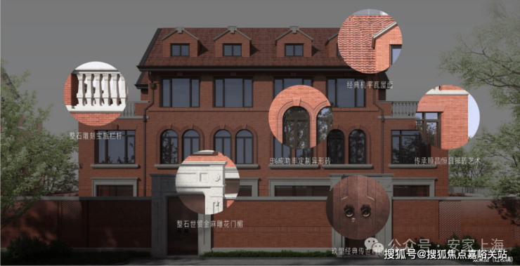 建筑基层石材选用近拟传统皇家建筑所用金山石的世贸金麻,经手工凿毛、酸洗做旧处理,搭配铜质落水管、水纹压花玻璃,每一处细节都在诉说海派大宅的优雅与贵重。